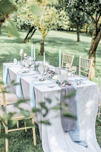 The pretty orchard gave a relaxed vibe for the table setting. Beth from Miss Carlysle and Co worked her magic with tableware and prop hire from Wren Prop Hire, showing how you can effectively style your reception tables without excess. Simple blue & grey table runners, with tall blue candles on clear candlesticks, are such a wonderful addition to a table, giving off a warm glow in the evening of your wedding day. Dusty blue napkins were added, completing the look with the silver cutlery and silver-rimmed chargers. Foliage and florals were draped down the middle of the table, in an organic yet relatively minimalist way. Table Styling - Beth from Miss Carlysle and Co and Kate from Wren Ark worked together to create the beautiful intimate table with the glasses, plates, cutlery through to the candlesticks, tealight holders, tealights and candles, working alongside the dusty blue colour palette with white linking with the blue.