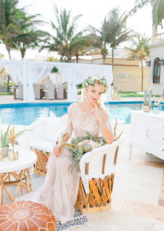 Created by the very talented Vanessa Jaimes, the most sought-after florist on the Riviera Maya; the floral designs were completely unique and modern. Inspired by the blue agave plant, designs were tropical and exuded pure boho luxe vibes. With a mixture of dried and fresh florals and plants, Vanessa’s designs flirt between boho and modern styles, creating this dreamy harmonious and earthy feel to the editorial.