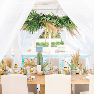 The colour palette is influenced by the main floral features - blue agave and the soft blush tones within the king protea. All other colours are neutral and predominantly green to enhance the tropical destination setting; with subtle blue and gold accents throughout the styling. The untouched and natural colours of the sea, villa and beachy setting suggested everything else to be kept clean, crisp and fresh to complement the stunning surroundings.