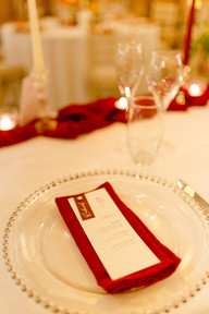 A burgundy chiffon table runner, silver beaded charger plates, burgundy napkins (standard fold), plain glassware (tumblers, champagne flutes, and wine glasses), silver & glass candlestick holders, burgundy & white candlesticks, silver cutlery and silver-rimmed tealight holders with tealights.