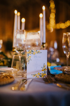 Miss Carlysle and Co provided - A 130 Light Blue Tablecloth, Gold Rimmed Tumblers, Gold Rimmed Champagne Flutes, Gold Rimmed Wine Glasses, Gold Cutlery, Dusty Blue Napkins, Gold Rimmed Charger Plates, Boho Placemats, Blue Chair Drapes with Yellow Ribbon, Gold & Gold-Rimmed Tealight Holders with LED Tealights, Gold Candlestick Holders with LED Candlesticks, Printed Place Names, Printed Menus & Printed Table Numbers.