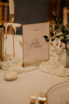 Table Numbers:Â Display table numbers in gold frames or on ivory cards with gold accents.