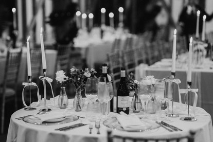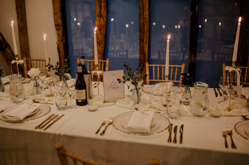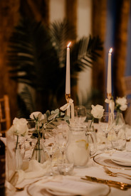 Props provided by Miss Carlysle and Co - Ivory Napkins, Gold Rimmed Charger Plates, Gold Cutlery, Gold Rimmed Glassware (For the couple only), Ivory Cheesecloth Table Runners, Gold Candlestick Holders (Small, Medium & Large), Ribbon for the Candlestick Holders and Gold Frames A5.