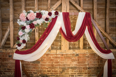 Props provided by C&C - A Wooden Hexagon Arch with White & Burgundy Draping, A Corner Faux Flower Arrangement and Waterfall Fairylights, a Long and Low Burgundy Faux Flower Arrangement, Dusty Rose Chiffon Waterfall Draping, A Wooden 'Pick a Seat not a Side' Sign, Faux Flower Pews Ends with Ribbon, Glass Cylinders with LED Pillar Candles,