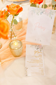 Full Gold Charger Plate x8, Gold Cutlery (Starter Fork x8, Starter Knife x8, Main Fork x8, Main Knife x8, Dessert Spoon x8 & Dessert Fork x8) x8, Gold Rimmed Glassware (Tumblers x8, Wine Glasses x8 & Champagne Flutes x8) x8, Gold Candlestick Holders x3 - LED Candlesticks x3 / Gold Tealight Holders x3 - LED Tealights x3, Peach Chiffon Table Runner x1, Peach Napkins (Lighter Cotton) x8 (Fold - Standard) and Peach Chair Drapes with White Ribbon x8 (Vertical Drape)