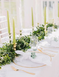 The table styling items used were - gold candlestick holders with white and green candlesticks, gold-rimmed charger plates, gold cutlery, plain glassware and white napkins.