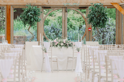 Gaynes Park is beautiful, true light, and airy. We reused our white chair drapes for the chairs on the top table, and we used our glass cylinders for the centrepieces but changed the candles to pillar candles.